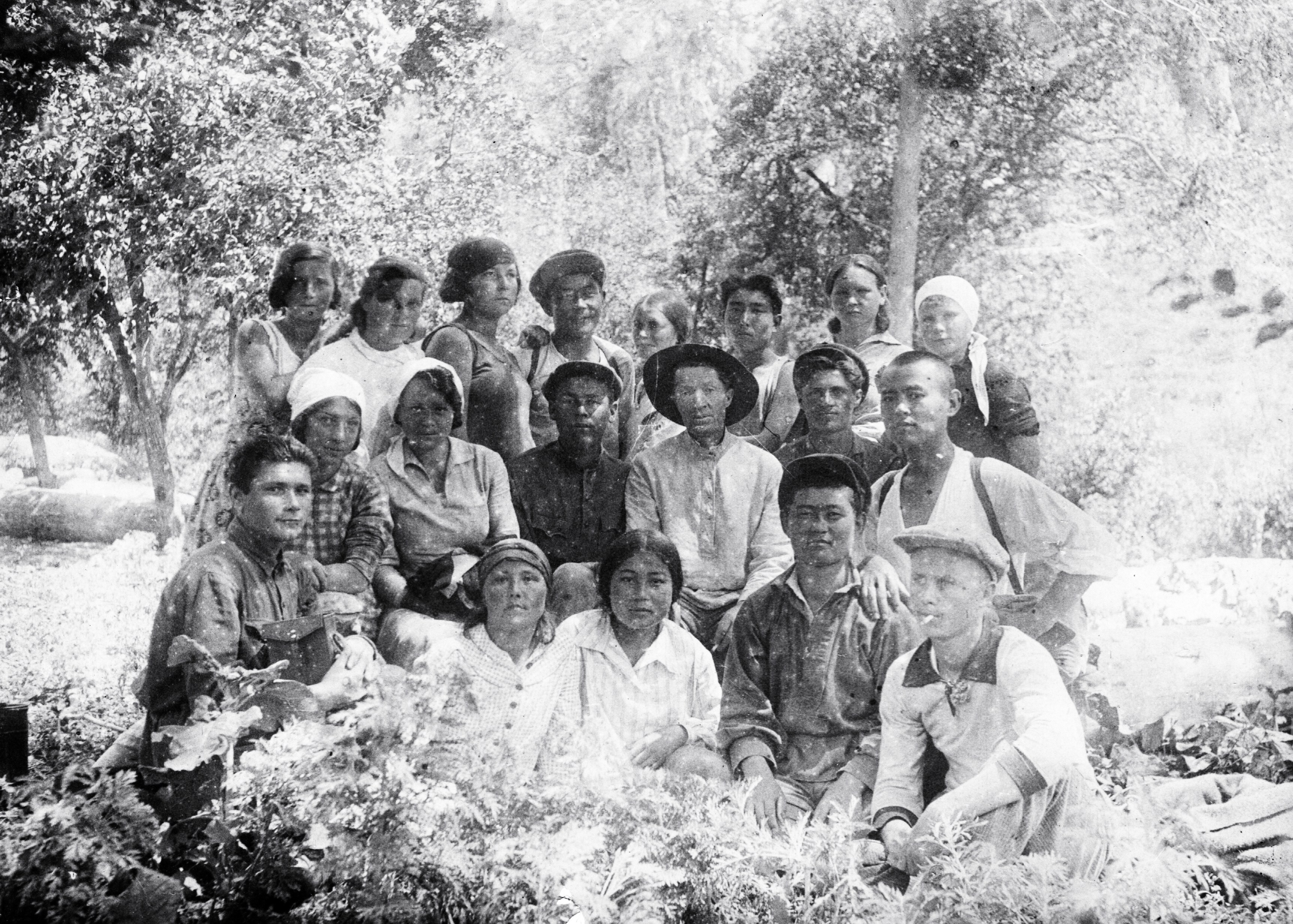 Участники турпохода - студенты Талгарского сельхозтехникума в Гончаровой щели. 1937 г.