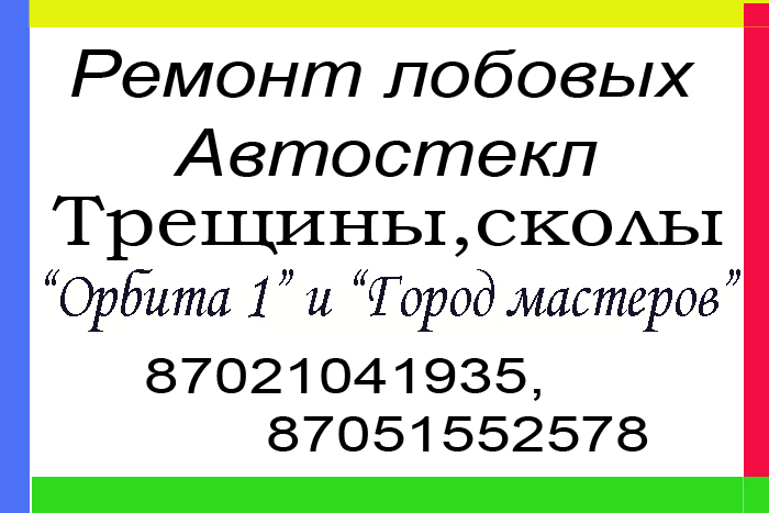 "мкр.Орбита" и "Город мастеров" на Толе би.Без выходных.Реставрация, ремонт. лобовых автостекл (трещины и сколы), а также фар и противотуманок. Возможен выезд.Увеличим (клиренс),просвет на любое авто..Установка видеокамеры и монитора заднего обзора. Продам мини мойку от 12 вольт ,объeм 15 литров.(Кешер).Продажей и установкой автостекл, не занимаемся.. Запиши на мобилу, или подскажи другу. Пригодится 3285033