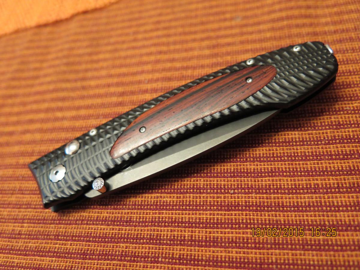 Вадим1959 Posted February 19, 2015 Author Posted February 19, 2015 Складной нож Silver Surfer E-10-1 Длина в открытом состоянии 192мм, в закрытом 110мм Клинок 87мм, по РК 76мм, спуски вогнутые, сведение 0,3мм, толщина в обухе 2,5мм, заточка 25 град на одну сторону. Толщина рукояти 9,2мм, ширина рукояти в середине 18мм по краям 20мм. Закалка 61 ед. Рукоять этого ножа из самой доступной серии элитных ножей William Henry изготовлена из твёрдого анодированного алюминия, который используется в военной авиации. Этот сверхлёгкий материал обладает высокой прочностью и износостойкостью. Накладки выполнены из разновидности палисандра – экзотического дерева кокоболо, произрастающее лишь вдоль побережья Тихого океана от Мексики до Панамы. Эта красивая древесина красноватого оттенка обладает необычной фактурой. Легкое в обработке, кокоболо обладает большой плотностью и твёрдостью. Со временем древесина меняет цвет на почти чёрный. Лезвие изготовлено из знаменитой инструментальной стали D2, пользующейся популярностью среди ножевых мастеров всего мира за свои качества. Она прекрасно держит заточку и обладает хорошей ударной вязкостью. Износостойкое покрытие из карбида вольфрама защищает лезвие от внешних воздействий и придаёт характерный матово-чёрный цвет. Нож снабжён удобным и надёжным замком «Button-lock» и легко открывается и закрывается одной рукой. 7 Quote
